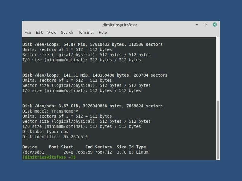 这将列出计算机中的所有硬盘和分区。识别出要在外部硬盘上格式化的分区。应该会提示磁盘大小。对我而言,USB 盘被标记为 /dev/sdb1。