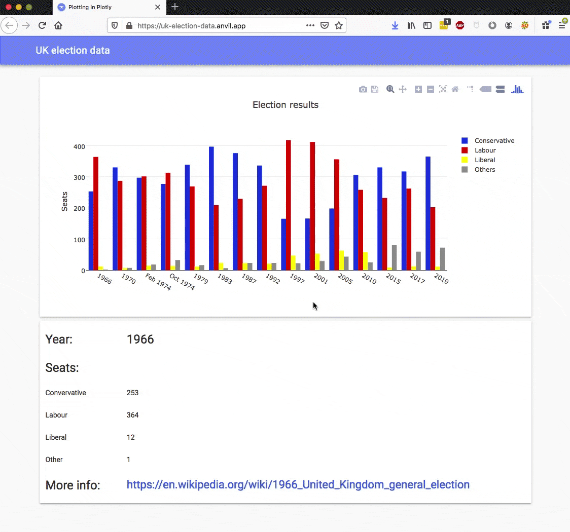 这很有用,当你想要在某些事件发生时执行任何你想要的代码就更好了(例如,当用户将鼠标悬停在栏上,你想要显示一个相关选举的信息框)。在 Anvil 的 Plotly 库中,你可以将事件处理程序绑定到诸如悬停之类的事件,这使得复杂的交互成为可能。