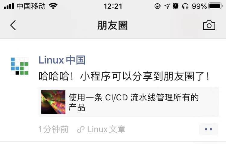 “Linux文章”小程序支持分享到朋友圈了