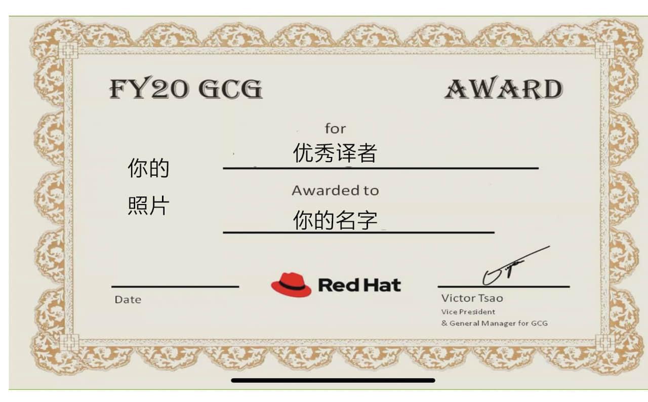- 来自红帽(Red Hat)公司正式颁发的专属贡献者证书