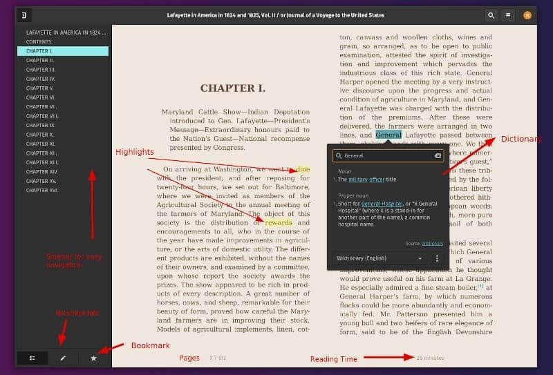 Foliate 解决了那些抱怨。Foliate 会显示书的估计剩余阅读时间和页数。你可以添加书签、高亮文本和添加注释。你可以导出数据,也可以轻松同步它们。