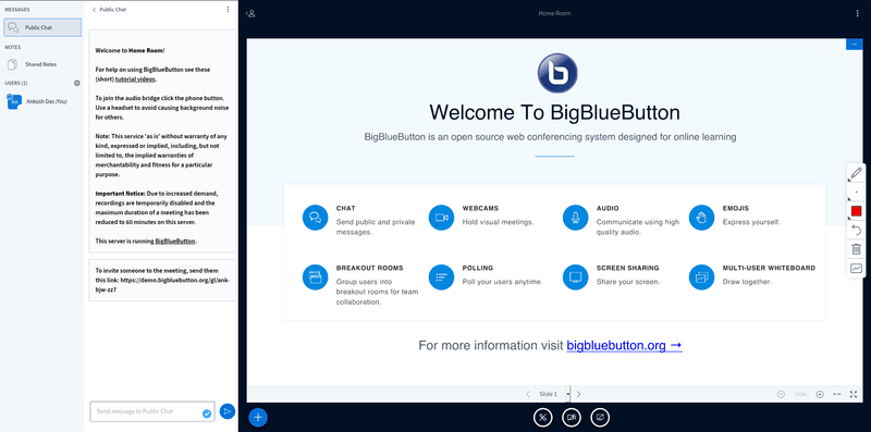 你可以尝试演示实例来临时免费地教你的学生。但是,考虑到使用演示实例来尝试 BigBlueButton 的局限性(限制为 60 分钟),建议你将它托管在服务器上,以探索其提供的所有功能。