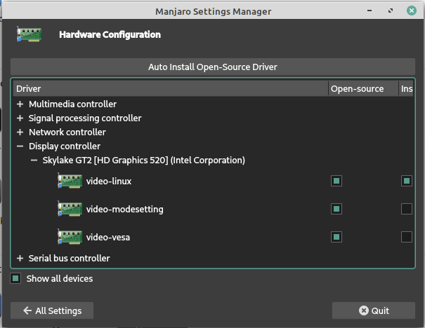 这个硬件检测工具非常有用,可以说是 Manjaro 受到社区喜爱的主要原因之一。它使得检测、安装、使用或从一个驱动切换到另一个驱动都非常简单,让硬件兼容性成为了过去。