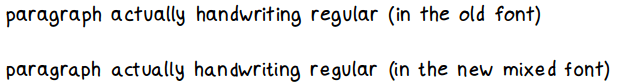 下面是旧字体和新字体的小样。我不认为新字体的“感觉”更像手写体 —— 有更多的变化,但还是比不上实际的手写体文字(在下面)。