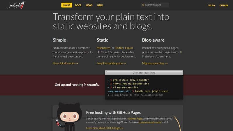 Jekyll 是用 Ruby 写的最受欢迎的开源静态生成工具之一。实际上,Jekyll 是 GitHub 页面 的引擎,它可以让你免费用 GitHub 托管网站。