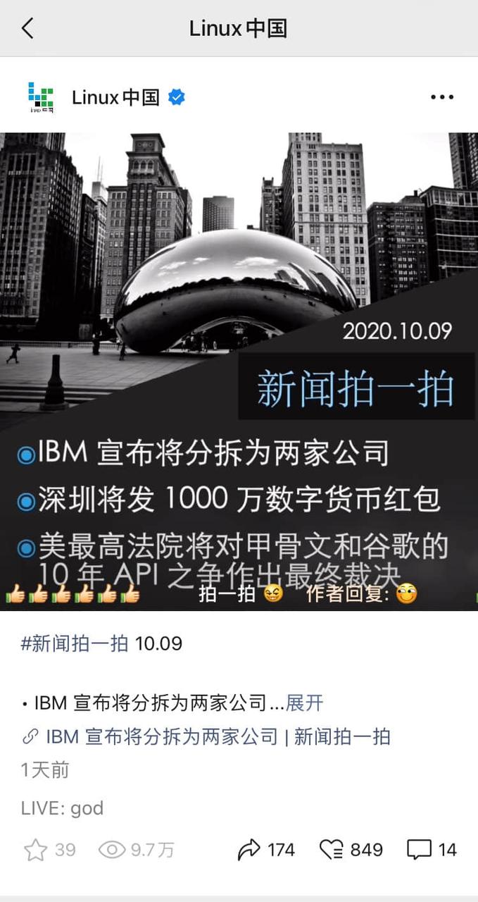 不料昨天,我们例行发布的《新闻拍一拍》短视频,虽然发布时间很晚,恰逢其中包含了一条《IBM 宣布将分拆为两家公司》的新闻,令人大跌眼镜的是,居然迅速取得了非常高的播放量:9.7 万。一个小时就就达到了数万播放量。而二十四小时后,该短视频几乎达到了 10 万播放量。