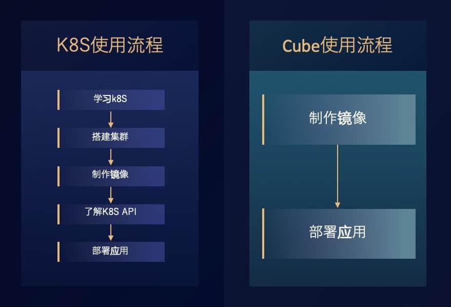 让我们横向对比一下,用户使用 Kubernetes 和 Cube 的流程上会有哪些区别。