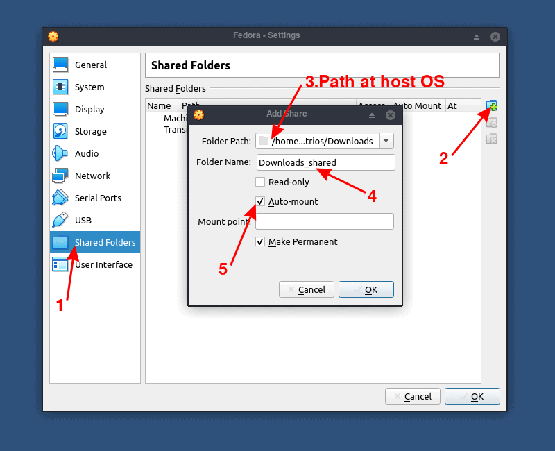 在本教程中,我将创建一个永久共享文件夹。在 VM 设置中添加你想要共享的宿主机系统文件夹,并选择你想要在 VM 中出现的名称。