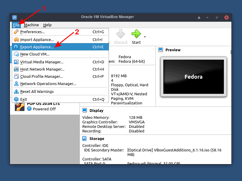 在 VirtualBox 主面板上,单击 “file”、“Export Appliance”。如果你喜欢键盘快捷键,你可以简单地点击 Ctrl+E。