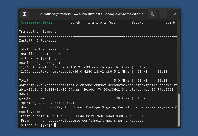 方式 3:使用命令行在 Fedora 上安装 Chrome