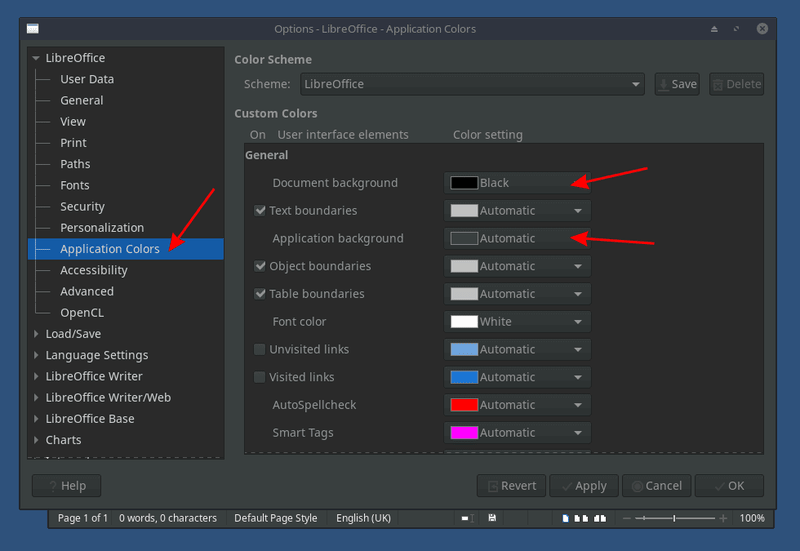 接下来,打开套件中的任意 LibreOffice 应用,例如 Writer。然后从菜单中,依次点击 Tools -> Options -> Application Colors,然后选择 Document background 和 Application backgroundBlackAutomatic(任意适合你的方式)。