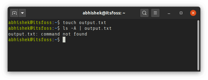 你可能对管道重定向很熟悉,可以使用它来组合 Linux 命令,但不能将输出通过管道传输到文件,它显示找不到 output.txt 命令:
