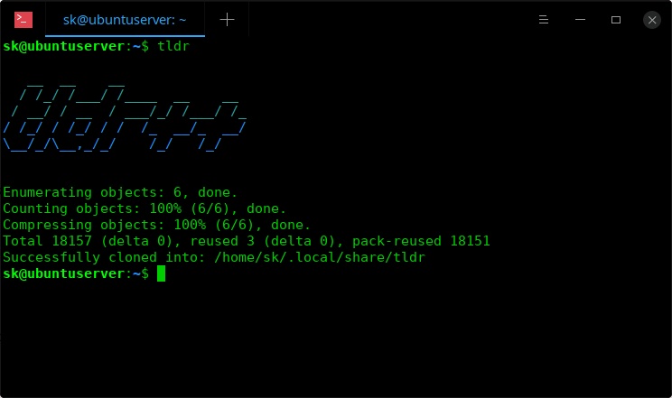 Enumerating objects: 6, done. Counting objects: 100% (6/6), done. Compressing objects: 100% (6/6), done. Total 18157 (delta 0), reused 3 (delta 0), pack-reused 18151 Successfully cloned into: /home/sk/.local/share/tldr