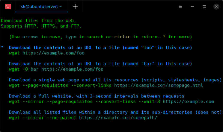 要使用命令行下载文件,我们主要使用 curl 或 wget 命令。让我使用 wget 下载文件。要打开 wget 命令的 TLDR 页面,只需执行以下命令:
