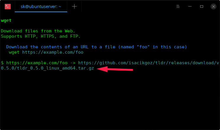 如果将文件下载到其他位置,只需键入完整路径,例如 /home/sk/Downloads/tldr_0.5.0_linux_amd64.tar.gz。