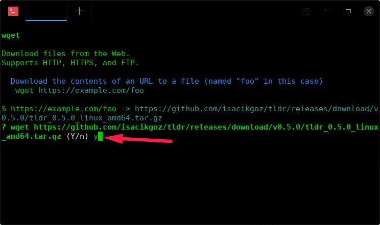 $ wget https://github.com/isacikgoz/tldr/releases/download/v0.5.0/tldr_0.5.0_linux_amd64.tar.gz $ tar xzf tldr_0.5.0_linux_amd64.tar.gz $ sudo mv tldr /usr/local/bin $ sudo chmod +x /usr/local/bin/tldr