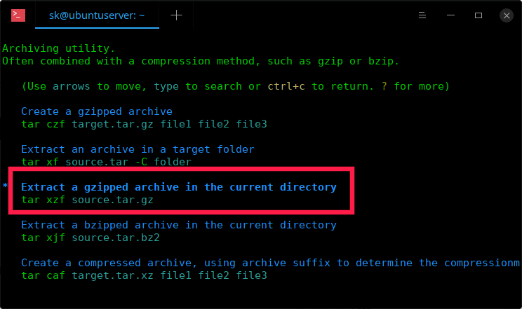 你将看到示例命令列表。浏览这些示例,找出哪个命令适合提取 tar.gz(gzip 格式)文件,按回车键。在我们的例子中,它是第三个命令。