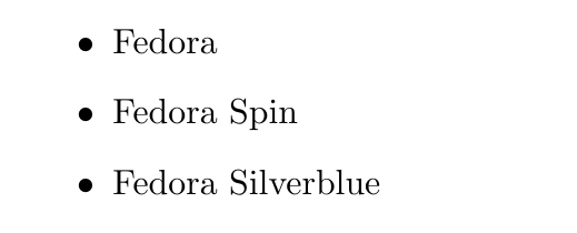 \begin{itemize}[noitemsep] \item Fedora \item Fedora Spin \item Fedora Silverblue \end{itemize}