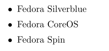 \begin{itemize} \itemsep0.75pt \item Fedora Silverblue \item Fedora CoreOS \end{itemize}