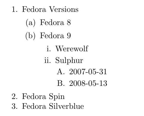 \begin{enumerate}[noitemsep] \item Fedora Versions \begin{enumerate} \item Fedora 8 \item Fedora 9 \begin{enumerate} \item Werewolf \item Sulphur \begin{enumerate} \item 2007-05-31 \item 2008-05-13 \end{enumerate} \end{enumerate} \end{enumerate} \item Fedora Spin \item Fedora Silverblue \end{enumerate}