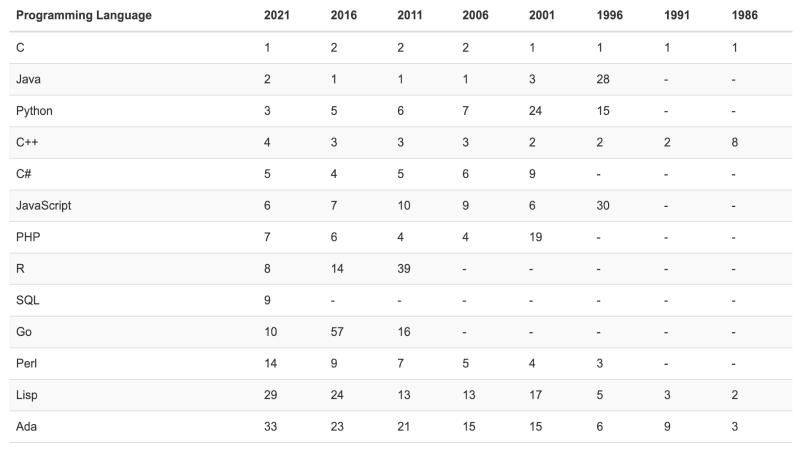 在 2021 年 2 月的榜单中,C 语言取得了第一名。与 2020 年相比,这两种语言在榜单上的位置互换了,但榜单的其他部分几乎与一年前完全相同。Python 位于第三位,其次是 C++、C#、Visual Basic、JavaScript、PHP 和 SQL。