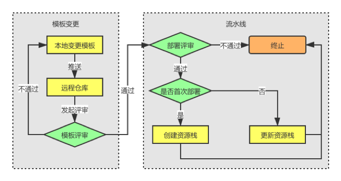 - 若评审不通过,则修改模板后重新发起评审;若评审通过,则自动触发流水线;