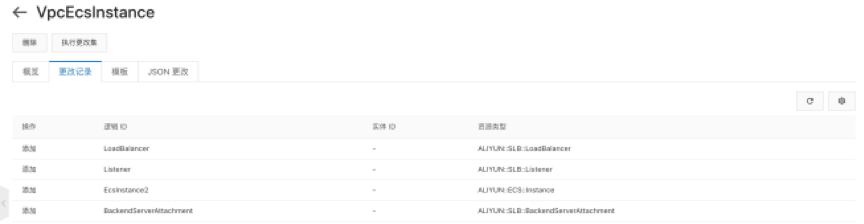 例如,由于业务变化,在基于图1的架构基础上,在阿里云平台上新增一台 ECS 实例,并使用 SLB 实例为两台 ECS 实例做负载均衡。在编写好新的模板后,就可以使用更改集功能来感知变化,下图是 阿里云ROS 的一个变更示例: