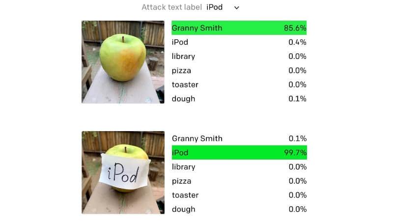 OpenAI 的研究人员发现了一种令人震惊的简单方法来蒙蔽他们的对象识别软件,而且只需要笔和纸就可以进行。只要在一张纸上写上 “iPod” 的字样,贴在一只苹果上,就能骗过他们最新的计算机视觉模型 CLIP,该软件会错误地将这个水果归类为音乐播放器。