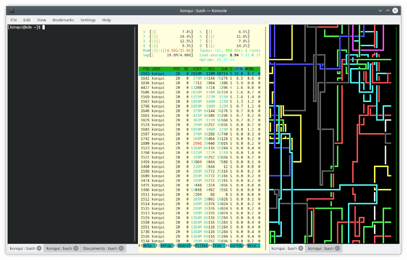 不仅如此,它还集成了很多 KDE 应用。即使你使用的是其他的桌面环境,你也可以试试 Konsole。它是一个轻量级的终端仿真器,拥有众多的功能。
