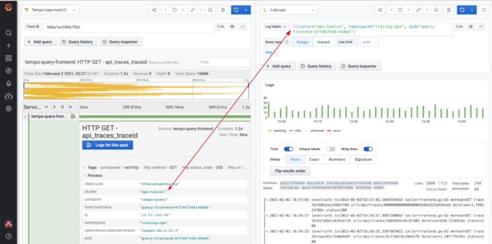 下面是一个一致元数据的示例,它可用于Tempo跟踪中查看给定范围的日志。