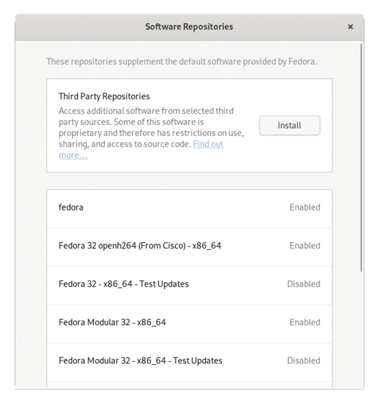 在 “软件仓库” 窗口中,你会看到顶部有一个 “第三方软件仓库”。点击 “安装” 按钮。当提示你输入密码时,就完成了。