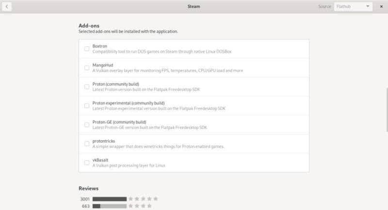 Flathub 版本的 Steam 也有几个附加组件可以安装。其中包括一个 DOS 兼容工具和几个 Vulkan 和 Proton 工具。