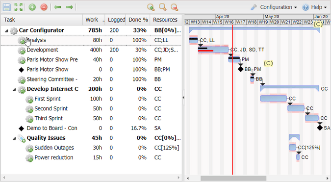ProjeQtOr 提供了一个甘特图编辑器,与 ProjectLibre 功能类似,包括按等级划分的任务、依赖关系以及基于计划工作和分配资源。但是,它不支持取值的就地编辑(例如,任务名称、估计时间等);用户必须在甘特图视图下方的输入表单中更改取值,然后保存。