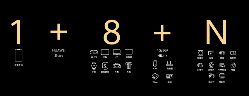 在鸿蒙的描述中,N 是指更多的 IoT 设备,他们可以通过鸿蒙系统借助 4G/5G/HiLink 等方式,和核心的 8 个产品进行连接,沟通,从而提升产品的智能性,让用户真正感受到产品的智能特性。