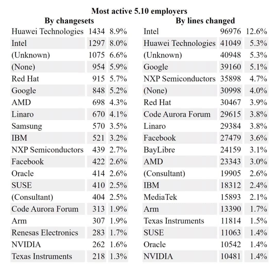 Linux 5.10 贡献排行榜,华为名列榜首