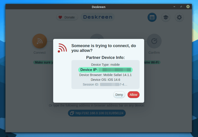 当你扫描二维码或在浏览器的地址栏中输入 IP 地址,你会在 Deskreen 应用上得到一个提示,允许或拒绝连接。除非是你不认识它,否则就允许吧。