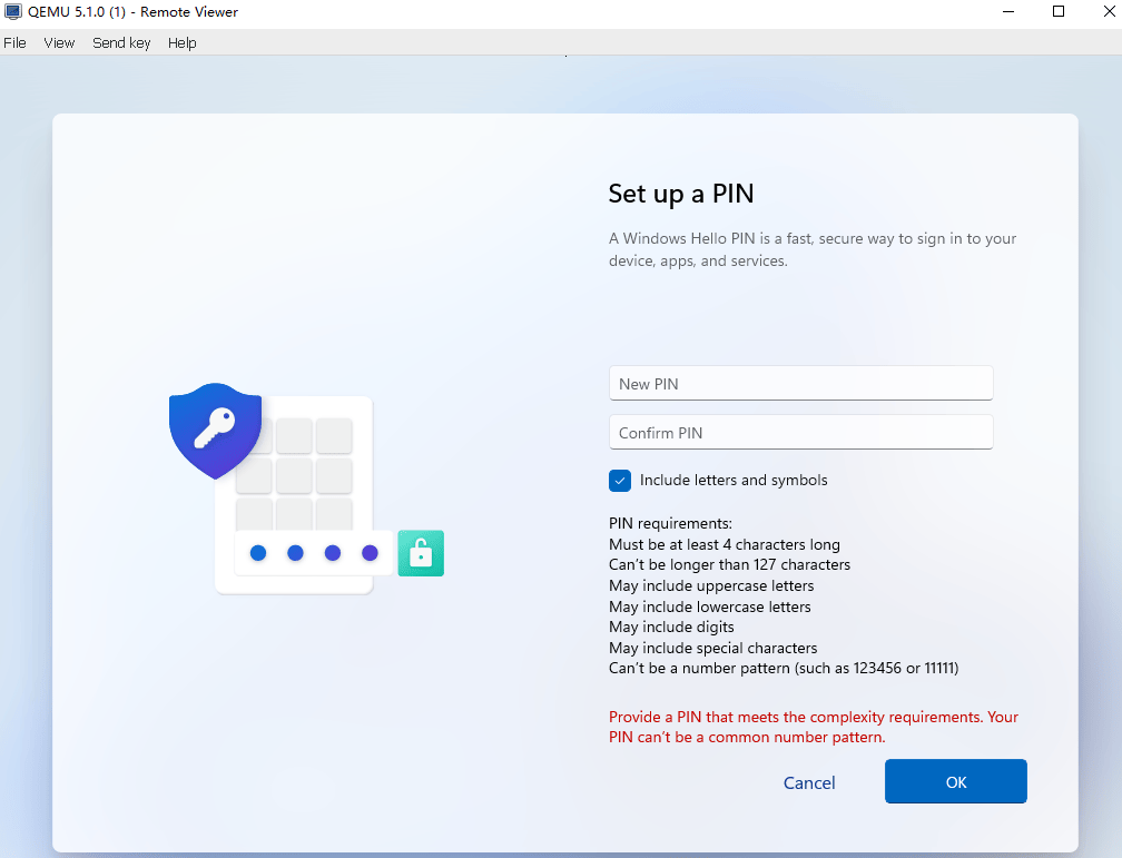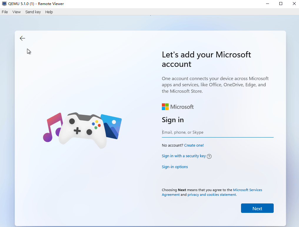 /qemu-5.1.0/build/x86_64-softmmu/qemu-system-x86_64 \ -enable-kvm \ -smp 4 \ -m 4G \ -machine usb=on \ -device usb-tablet \ -display default \ -vga virtio \ -device e1000,netdev=net0 \ -netdev user,id=net0,net=192.168.20.0/24,dhcpstart=192.168.20.20 \ -drive file=/win11/windows11.qcow2,if=virtio \ -drive file=/win11/virtio-win.iso,index=1,media=cdrom \ -drive file=/win11/windows11.iso,index=2,media=cdrom \ -spice port=8891,addr=172.17.81.26,disable-ticketing