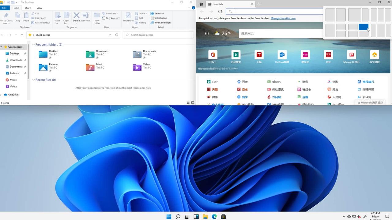 在窗口的最大化按钮上,鼠标悬停,即可出现 “Snap Layout” 布局窗口,然后可以选择一种布局,将该任务放置到某个位置中。这样做的目的是为了方便多任务同时处理。