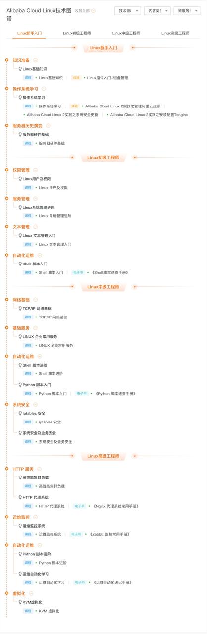 这份《Linux 技术图谱》涵盖了《Linux 基础知识》、《服务器硬件基础》、《Linux 系统管理进阶》、《Linux 企业常用服务》、《高性能集群负载》等共计 19 门课程,11 门在线实验室和 5 本电子书,4 门线上学习训练营内容,涉及到在技术工作中的绝大多数场景,可以帮助你更好的完成自己的学习和工作。