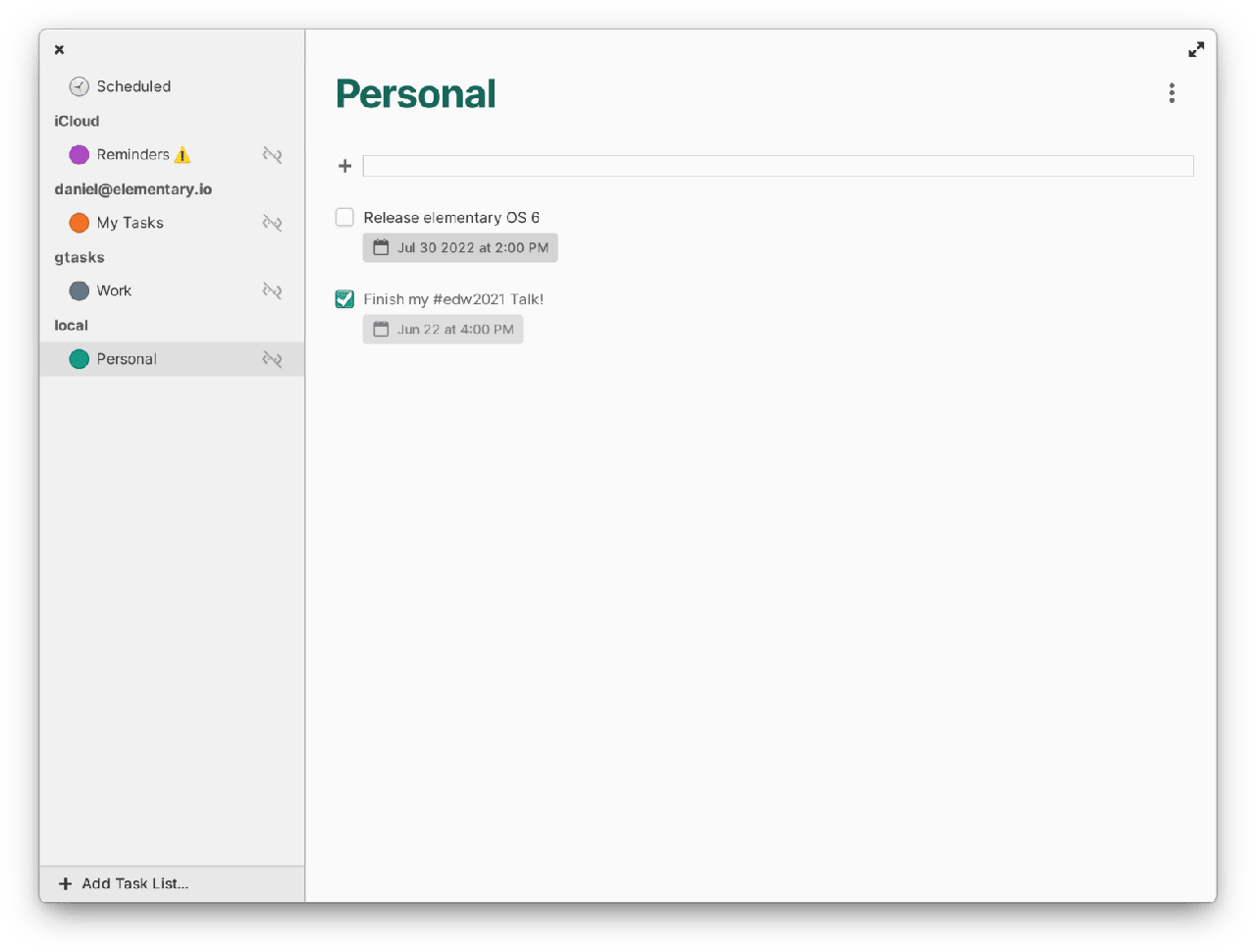 elementary OS 6 中添加了一个新的任务应用,在那里你可以管理任务、收到提醒,并在你的系统上组织任务,或与在线账户同步。
