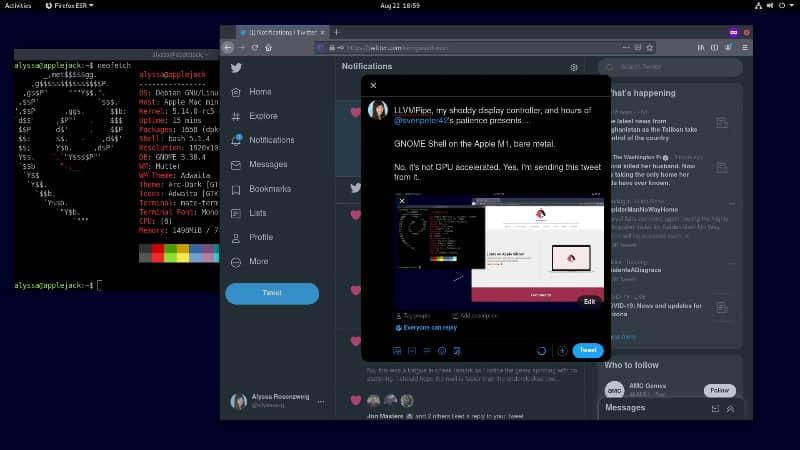 Asahi Linux 团队的一名成员展示了在苹果 M1 芯片上运行的 GNOME 桌面。该团队说,“不是很好,但可以使用”。该团队自 1 月份以来一直致力于苹果 M1 GPU 的逆向工程,其目标是“在苹果 M1 Mac 上实现完美的 Linux 体验”。根据截图上的终端显示,它正在运行 5.14 Linux 内核的预发布版、Debian Linux 和 GNOME 3.38.4。但是该团队说,“它不是 GPU 加速的。”新的演示是今年 1 月份 Corellium 早期实验的一个相当大的进步,采用了“双缓冲”机制以减少撕裂现象。