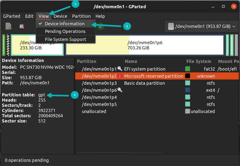 在 Gparted 中,通过菜单选择 View->Device Information(查看—>设备信息)。它会在左下区域显示磁盘信息,这些信息中包含分区方案信息。