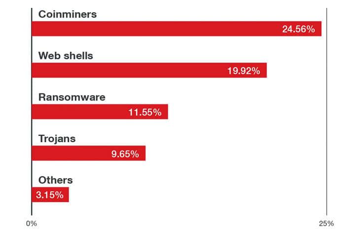 该公司检测到近 1500 万个针对基于 Linux 的云环境的恶意软件事件,发现加密货币矿工和勒索软件占所有恶意软件的 54%,Webshell 占 29%。