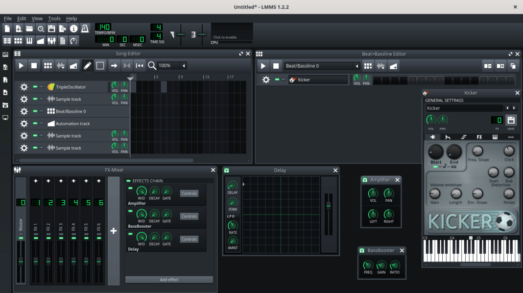 LMMS(即 Linux 多媒体工作室 )是一个全面的音乐创作应用。你可以从头使用 LMMS 用你的电脑开始制作你的音乐。你可以根据自己的创意创造旋律和节拍,并通过选择声音乐器和各种效果使其更加完美。有几个与乐器和效果有关的内置功能,如 16 个内置合成器、嵌入式 ZynAddSubFx、支持插入式 VST 效果插件、捆绑图形和参数均衡器、内置分析器等等。LMMS 还支持 MIDI 键盘和其他音频外围设备。