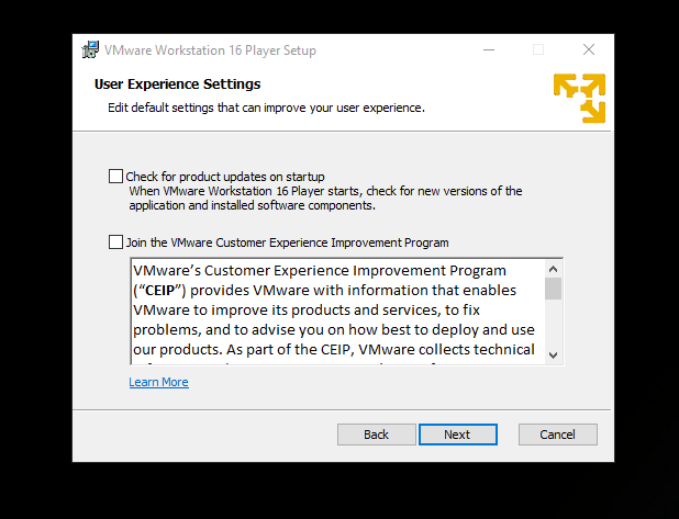 进入下一步,你可以选择禁用每次启动程序时的更新检查(可能很烦人),并禁用向 VMware 发送数据,这是其用户体验改进计划的一部分。