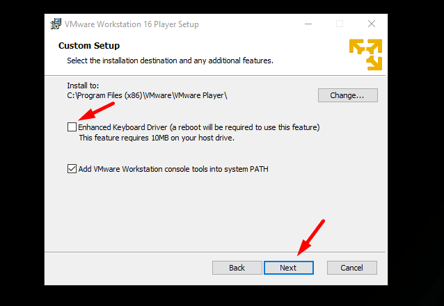 现在,你可以选择安装的路径。理想情况下,保持默认设置。但是,如果你在虚拟机中需要更好的键盘响应/屏幕上的键盘性能,你可能想启用 “ 增强型键盘驱动程序 ”。