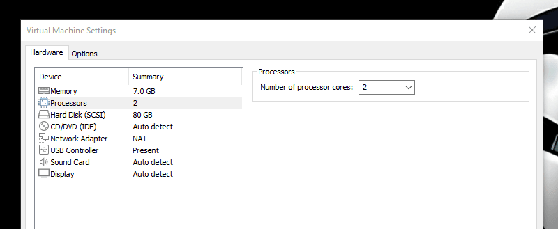 在这种情况下,我有 16GB 的内存和一个四核处理器。因此,为这个虚拟机分配近 7GB 的内存和两个内核是安全的。