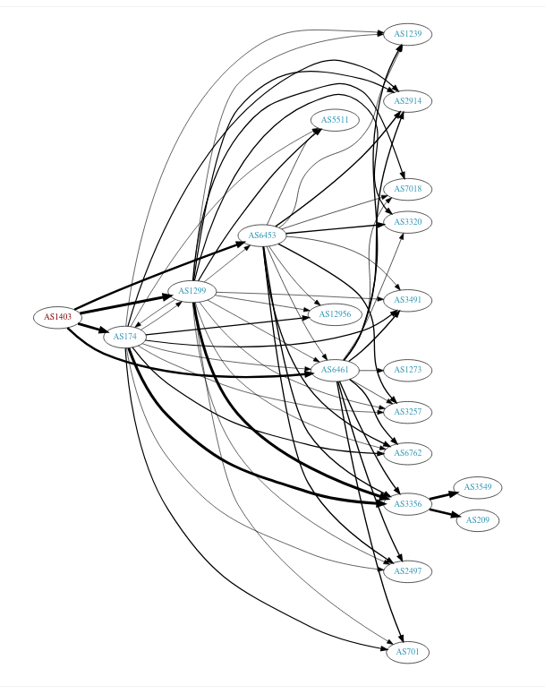 最短的是 6939(“Hurricane Electric”),它是一个 “全球互联网骨干”。他们也有自己的 Hurricane Electric 观察镜 页面。