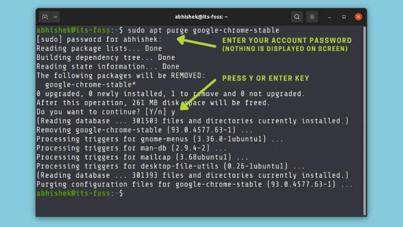 根据要求输入你的账户密码。当你输入密码时,屏幕上没有任何显示。这没关系。输入它并按回车键,确认删除。