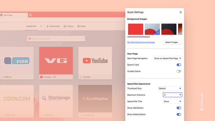 如今,得益于 Vivaldi 新增的开始页面快速设置面板,这种情况将成为过去式。现在,所有与开始页面有关的选项都在同一位置,大幅改进了用户体验。